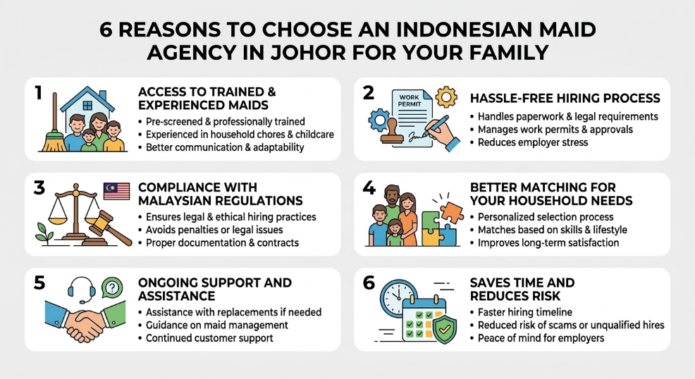 Choosing an Indonesian maid agency in Johor is the most practical and reliable way to hire a domestic helper for your family. From accessing trained maids and ensuring legal compliance to receiving ongoing support, agencies make the entire process easier and more secure. By understanding these six key reasons, you can make a confident decision and find the right helper to support your household needs.